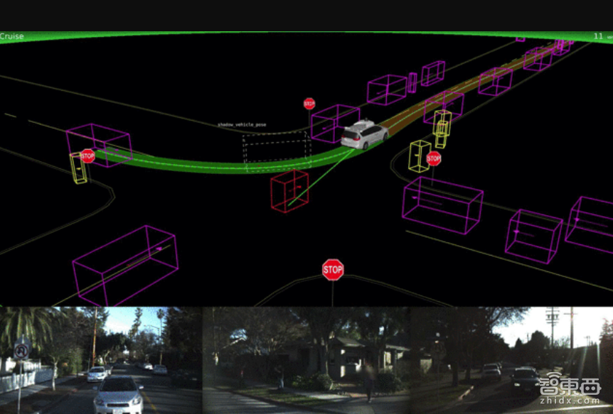 下面这段视频也许可以让你看得更明白。这是一个复杂的四向停车点,出现在真实世界,位于山景城。当汽车向左转弯时,一辆自行车靠近,汽车感到困惑,于是在路上停车。工程师看到了问题,修改软件,让它正确回应。在视频中我们可以看到真实场景是怎样的,在真实场景上面是模拟测试。两种情况分离之后,你会看到模拟汽车继续前进,后面出现一个盒子,上面贴有标签“shadow_vehicle_pose”,它告诉我们真实世界发生了什么事。对于Waymo工作人员来说,这样就可以用视觉化形式看清整个过程。