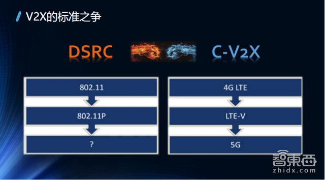 V2X内部分化出两个技术阵营——中国(加上美国的高通公司)支持的是和4G网络原理相同的C-V2X,而美日欧大力发展从WiFi技术原理演化而来的DSRC。较晚诞生的C-V2X正在快速发展,并且赢得了通信标准制定组织3GPP的支持。