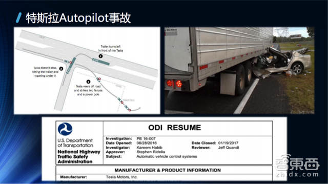 那么右边这张图是当时发生车祸的现场,可以看到是一个很惨烈的现场。为什么会发生这种事情,下面我们一起来分析一下在这个过程中Autopilot里面的技术到底存在什么样的问题而导致这个事故的发生。大家可以看到PPT最下面的信息,就是美国公路局美国交通部所发布关于这件事情的一份调查的报告,感兴趣的同学也可以去搜一下。