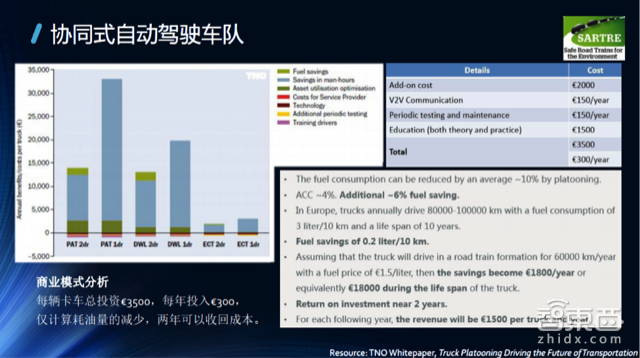 这张图做了一个解释,协同式自动驾驶的商业模型,其实这里面数据都已经讲得很清楚了,我大概解释一下,左边这张图上的纵轴代表每年投入和成本的大概的分布,而右上角这张图是讲的是成本会花费在哪里,然后右下角这张图主要讲了他做的一些推算,结论是每辆卡车投资是3500欧元,然后再加上每年投入300欧元的成本,其实油量的节省两年就可以收回成本了。