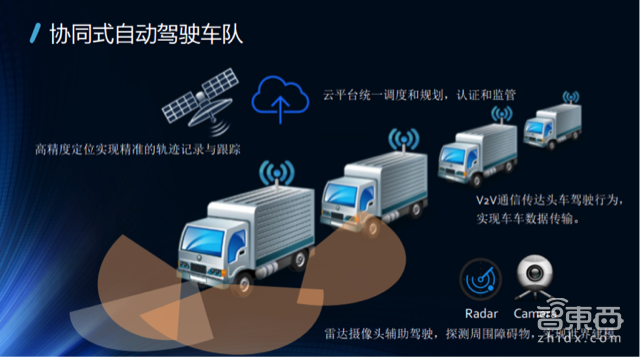这张图展示了协同式自动驾驶车队的系统组成,从最上面可以看到,它可以从云端统一来规划、调度、认证和监管各个车辆,同时它通过高精度定位实现精准的轨迹记录和跟踪;对于前车,它还会配备摄像头和雷达来探测前方的道路和障碍物,实现世界建模,然后通过传达自己的驾驶行为意图,来告诉车队里面所有跟随的车辆,从而实现协同式自动驾驶的系统组成。