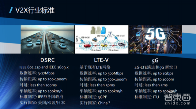 从这张图大家可以看到DSRC、LTE-V以及将来升级到5G的过程在行业标准的情况。DSRC即“Dedicated Short Range Communications”,就是专用短程通信技术,它的标准已经非常成熟,因为它本身就基于wifi,因此到现在应用得非常广泛,目前美国一直在推行这个标准,然后欧洲还有日本也都是基于DSRC技术去推进自己V2X的进展,同时美国也正在准备通过立法来推进这项技术。