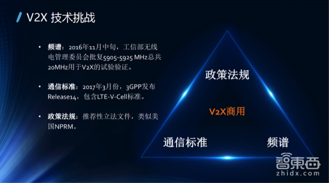 所以从这里面可以看到,主要有政策法规,通信标准和频谱这三个挑战,因为V2X光靠整车厂的力量是很难去推动它,需要国家层面的一些扶持,尤其是频谱这方面。而LTE-V在2016年11月份的时候已经有个初步的评估的划分;2017年3月份,3GPP在标准方面已经初步发布了一个Release 14,但是最终就是完全的发布被close掉。政策法规只有美国在尝试,同时也在做立法性的推行。
