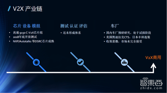 从产业链来说,现在主要的一个芯片模组只有DSRC是比较成熟的,而LTE-V现在商用的芯片和模组还没有很成熟,只有高通在这个月刚发布了它们的一个9150芯片组,但是也没有正式地把它封装成可用的商业化模组,可能只有到2018年的时候才可能会有一些开放测试;然后测试、认证、评估体系也没有完全建立起来,现在很多的车厂都是处于预言和观望的态度。凯迪拉克的CTS和丰田也在往前去做,但是我们知道V2X是一个规模的行业,只有大家一起来把这个做起来,只有路面上带V2X模组数多了,它的应用才能做的起来,如果只有一两辆车有V2X,那是没法做起来的。