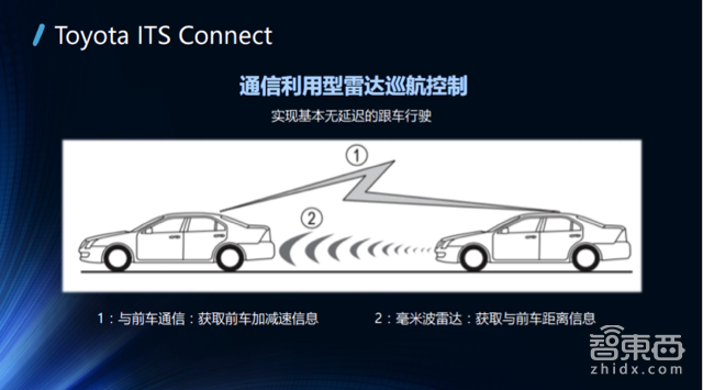 这个就是我刚才在前面讲到了Toyota(丰田),他们做的是ITS设备,他们在车上装V2X已经实现了很多Feature,感兴趣的同学可以自己去查一下。在里面有一个我觉得是比较有意义的,就是他们在做的ACC,加入这个群里面的朋友应该都是之前都做过ADAS,或者是做自动驾驶相关行业的专家,大家都知道ACC一般用毫米波雷达,最早也是用毫米波雷达,但是我们知道毫米波雷达往前探测是有一定距离的,所以对于足够远的高速公路的话是有一定的盲区的,因此在后来变成第二代的时候就演变成视觉再加一个毫米波雷达这样的感知技术。