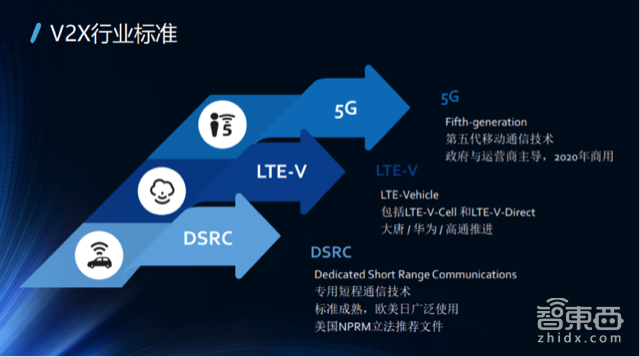 LTE-V其实就是LTE-Vehicle,就是针对车的LTE技术,主要包含LTE-V-Cell和LTE-V-Direct,主要是的大唐、华为和高通在推进这个事情,可以看到都是以前LTE的一些大的玩家在做这件事情,同时我们也知道这是下一代主要的通讯技术。
