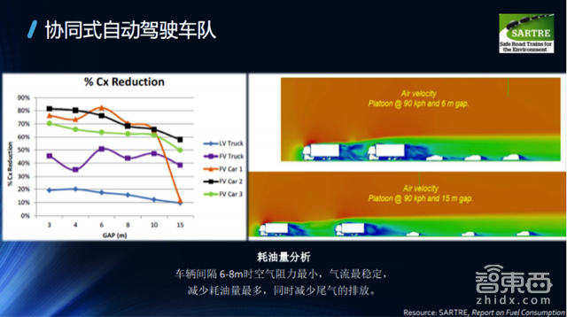 同样这张图还是讲述了由SARTRE所研究出来的一些结果,感兴趣可以自己看一下,已经讲得非常非常清楚了。通过右边这两个模型的建立,在90公里行驶过程中,6米的行车距离和15米的行车距离的过程中,大家可以得到左边这张图显示出来的数据,可以看到油耗可以很明显的降低,在6到8米的空气阻力的时候最小,这时候气流最稳定,降低了油耗是最多的。对于SARTRE做的这些数据,我认为如果我们后面要通过V2X做协同式自动驾驶车队的时候,这是一个非常好的借鉴的数据,而业内的同仁如果感兴趣做相关业务的话,可以很好地去研究一下他们的这些数据和相关结论。