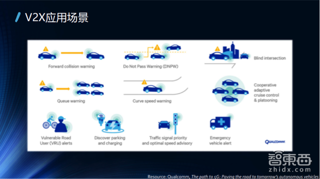 这张图也是很清楚地介绍了一些比较典型的应用场景,比如第一个是前车碰撞的预警,第二个是拥堵的后方提示,然后下面是对于无障碍道路的提醒,以及后面关于找充电桩、找停车位,还有关于一些其他的协同式的车队等等,这张图已经讲得很清楚,大家回头可以看一下。