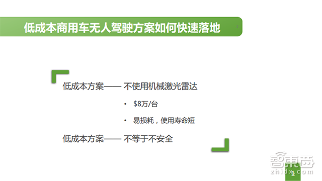 最后还有成本问题,只有做到低成本,才能商业化。我们认为现在传感器的价格不能接受商业化,因为传感器本身比车还贵。