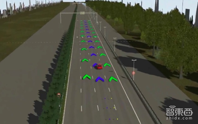 除了把高精地图和感知结果放在仿真场景里,我们还能做什么?这张图上可以看出来一共有三六箭头,同时在车后还有很小的两六圆点,三六箭头分别是绿色、蓝色和绿色,蓝色是主预测路径,而绿色是可并线区域。但是如果你并到最右边上了,就会只剩下左边的绿色箭头和中间的蓝色的箭头了。这个示范就是说你可以用高精地图,用EHP,同时用路径规划,在仿真软件中同时实现高精定位的结果,后面的两六点黄色的点就是GPS定位的结果,蓝色是高精定位和相对定位定出来的点。